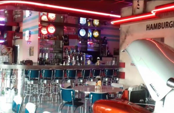 Tout cela dans une ambiance des années 50-60, où les lieux sont pourvus d’un mobilier typique : chaises bleues à contours argentés, tables pailletées, carrelage à damier bleu / rose, mais aussi d’un cadre regorgeant de souvenirs visuels liées à l’Age d’Or Américain tels que : répliques murales, néons, voitures de l’époque, motos, pompes à essence, feux de signalisation… et tous les autres objets de taille réelle occupant l’espace et créant l’ambiance du restaurant. American Way.